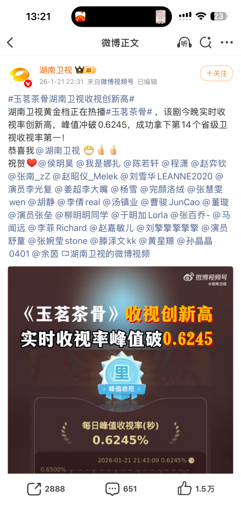 欢娱影视出品的古装爱情悬疑剧《玉茗茶骨》近日迎来网络平台收官,卫视播出则再创佳绩,以0.6245%的实时收视率创新高,湖南卫视也拿到了剧播以来第14个省级卫视收视日冠。该剧打破了荧幕的边界限制,把非遗茶文化,变成了大众能真切感知、主动参与的文化现象,更借着剧情的情感共鸣和欢娱影视多年积淀的内容生态,让IP价值持续沉淀、实现商业复利,为影视行业做文化IP开发、品牌营销,拿出了可参考的全新范本。