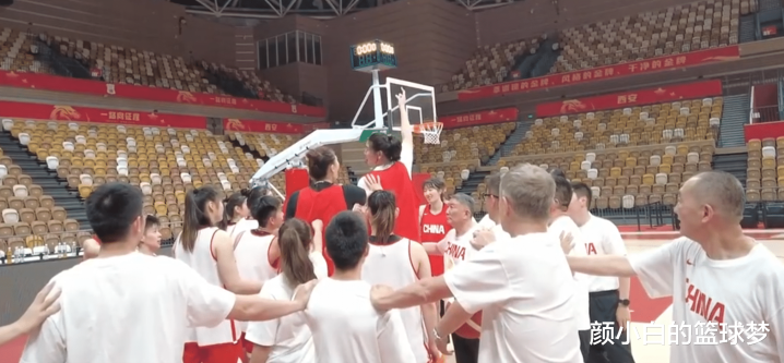 在训练结束后全队站在一起将手搭在背上,张子宇是最前方的那个,似乎是所有人的期许都在张子宇这位18岁的小将身上,张子宇跟全队站在一起就是鹤立鸡群一般的存在。