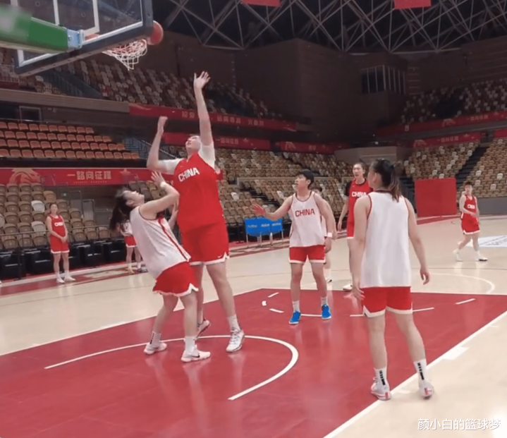 在张子宇热身完毕后,女篮也进行了3V3的半场对抗训练,可以看出李缘、韩旭、张子宇在一队,张子宇在篮下的尺寸优势非常明显,各种篮下予取予求。