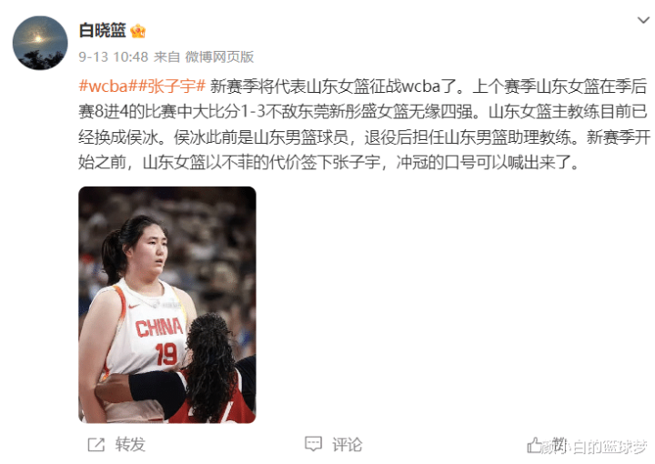 9月13日,媒体人白晓篮爆料,山东女篮花大价钱签下了张子宇,下赛季张子宇将代表山东女篮出战WCBA。