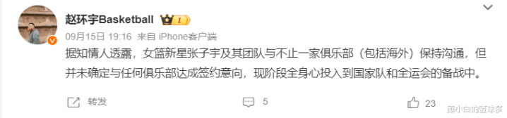 但9月15日媒体人赵环宇辟谣:张子宇及其团队与不止一家俱乐部)包括海外保持联系,但她并没有确定与任何俱乐部签约,现阶段是全身心备战国家队与全运会。