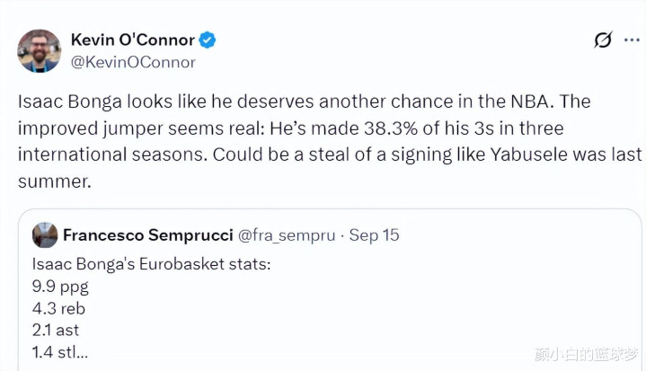 就连NBA记者凯文-奥康纳都说邦加看起来值得在获得一次机会,他的跳投有很大进步,过去三个赛季,他的三分命中率达到38.3%。(他是2018年次轮39顺位,进入联盟时效力洛杉矶湖人队)