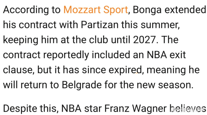 邦加上赛季效力塞尔维亚联赛的贝尔格莱德游击队,他今夏已经跟游击队续约到2027年,而且他合同中的重返NBA条款已经失效(过了时效),所以他下赛季不得不重返塞尔维亚联赛。