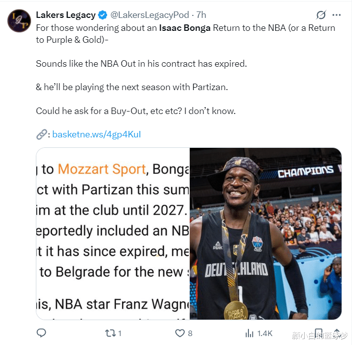 但湖人媒体写道:很多球迷询问湖人队是否可以重新签下邦加让他代表湖人出战,但他已经跟游击队完成了续约,除非他提出跟游击队买断,签约他的球队支付买断费/自己支付买断费之类的运作才可能重返NBA。(亚布塞莱此前重返NBA就是自己支付的买断费)