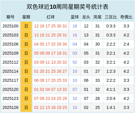 双色球近十周同星期奖号统计表