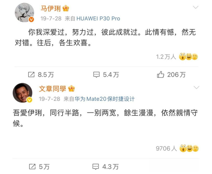 老百姓有句俗话,伤口好了也有一道疤。文章和马伊琍的婚姻终于在2019年走到了尽头,一个说“往后各生欢喜”,一个说“同行半路,一别两宽”,看得人唏嘘不已。